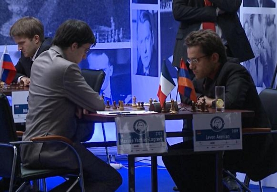 01.05.2013 - Relativ zeitig wussten die Verfolger von Tabellenführer Boris Gelfand in der Schlussrunde des Alekhine Memorials, was die Stunde geschlagen hatte. Der Israeli hatte Weiß gegen den amtierenden Weltmeister und wählte eine zu ruhige Eröffnung, um einen wirklichen Kampf zuzulassen. Alsbald rauchten die Freunde die Friendenspfeife, was besonders Levon Aronian die erhoffte Möglichkeit bot, mit Gelfand gleichzuziehen. Denn im Falle eines Sieges gegen Maxime Vachier-Lagrave hätte er mit 3 die höhere Anzahl an Siegen vorzuweisen, was das zweite(!) Tiebreak-Kriterium war. Erstes war die Summe der Schwarzpartien, was sich nach wie vor extrem unfair anhört, oder? Wie auch immer, der Armenier spielte druckvoll, zwang den Franzosen bei knapper Zeit zu Fehlern und siegte! Kaum hatte Lagrave aufgegeben, durfte sich Aronian ziemlich sicher sein, der Turniersieger zu sein, denn zwischen Michael Adams und Vladimir Kramnik stellte sich nur noch die Frage, ob letzterer gewinnen würde oder nicht. Aber natürlich freute sich Lev erst, als Adams nach langem Kampf und einer unberechtigten Remisremaklation(!) aufgab. Herzlichen Glückwunsch, Levon Aronian! Gelfand ist Zweiter vor Vishy Anand, der alleiniger Dritter ist.