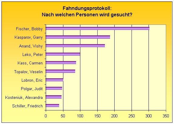 04.08.2005 - Internet-Surfer suchen auf www.chesstigers.de nach bekannten Persönlichkeiten der Schachszene, nutzen dabei Google oder andere Suchmaschinen ihres Vertrauens. Heraus kommt eine Rangliste der populärsten Personen der Chesstiger-Webseite – wenn es nach dem Informationsbedürfnis der Online-Besucher geht.
