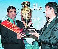 Vishy Anand (left) receives trophy in Teheran. Foto: Vahid Sahemi AP