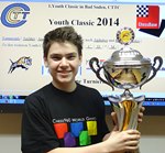 20.01.2015 - Am 19.Januar 2015 fand die 3.Etappe der Chess960-Rally im Chess Tigers Training Center in der Brunnenstraße 9 (B9) in Bad Soden am Taunus statt. Immer mehr wird zum Thema: "Arrivierte gegen neue Himmelsstürmer". Großartig und von hohem Interesse sind die Aufeinandertreffen zwischen den jungen Teilnehmern und den Titelträger. Zum einen bekommen die jungen Kerle das Gefühl: "Ich kann schon einen IM schlagen". Auf der anderen Seite ist es für das Establishment des regionalen Schachs nicht gar so dramatisch, mal eine Chess960-Partie gegen einen Jungspund zu verlieren - es ist ja nur Chess960 und sogar nur Schnellschach 10min + 5s ist die zeitliche Distanz. Für den Flyer der Youth Classic 2015 wurde noch ein Bild gebraucht mit dem Sieger 2014 Samuel Weber und dem 66 cm hohen Pokal, um die Rundenturniere "Youth Qualifier" vom 4.-6.September 2015, dem "Youth Challenge" vom 2.-4.Oktober 2015 und dem finalen "Youth Masters" vom 30.Oktober bis 1.November 2015 anzukündigen - zufällig hatte er sein Chess960-T-Shirt der Chess Classic von 2008 an. und viele Bilder mehr ...