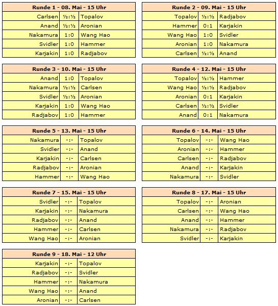 Gespielt wird ein neunrundiges Rundenturnier mit zehn Spielern. Rundenstart ist täglich um 15:00 Uhr unserer Zeit - lediglich die letzte Runde startet bereits um 12 Uhr. Ruhetage werden am 11. und 16. Mai eingelegt.