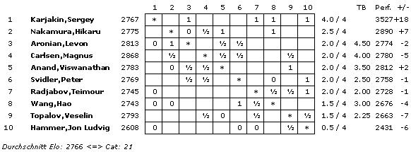 Mit einem ELO-Schnitt von 2766 wird die Turnierkategorie 21 erreicht.