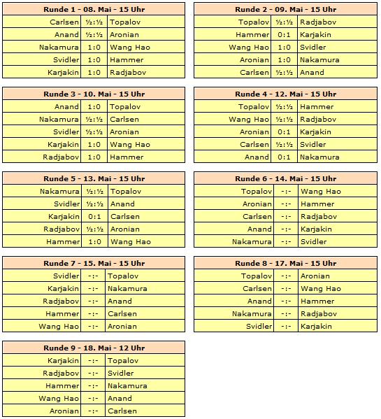 Gespielt wird ein neunrundiges Rundenturnier mit zehn Spielern. Rundenstart ist täglich um 15:00 Uhr unserer Zeit - lediglich die letzte Runde startet bereits um 12 Uhr. Ruhetage werden am 11. und 16. Mai eingelegt.