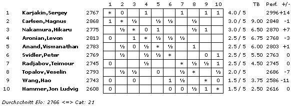 Mit einem ELO-Schnitt von 2766 wird die Turnierkategorie 21 erreicht.