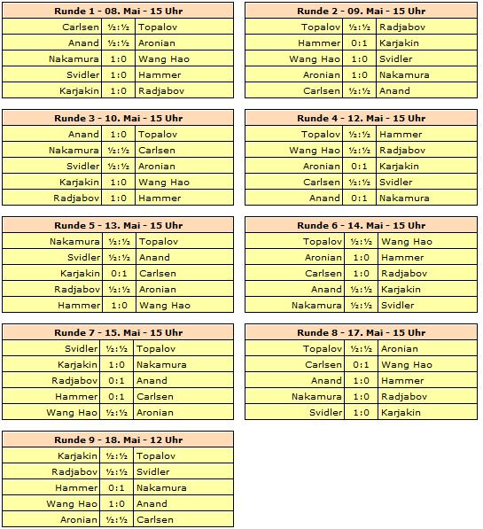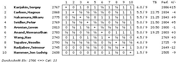 Mit einem ELO-Schnitt von 2766 wurde die Turnierkategorie 21 erreicht.