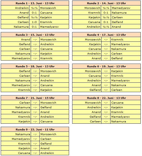 Gespielt wird ein neunrundiges Rundenturnier mit zehn Spielern. Rundenstart ist täglich um 13:00 Uhr unserer Zeit - lediglich die letzte Runde startet bereits um 11 Uhr. Ruhetage werden am 16. und 20. Juni eingelegt.
