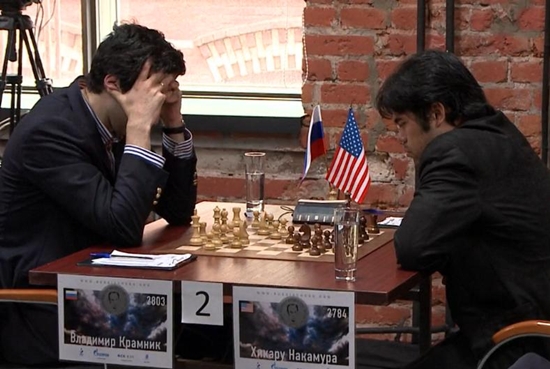 14.06.2013 - Die Statistiken besagen es, und das heutige Ergebnis in der zweiten Runde des Tal Memorials belegt es: Vladimir Kramnik hat Probleme, mit Weiß gegen Hikaru Nakamura zu bestehen! Na gut, wenn man ehrlich ist, dann kam Kramnik ausgezeichnet aus der Eröffnung und stand laut den berüchtigten Engines kurz vor dem Sieg, als er urplötzlich den Faden verlor. Allerdings muss man auch unbedingt Nakamuras exzellentes Spiel loben, mit welchem er sich selbst an den Haaren aus dem Sumpf zog und seinen Gegner stattdessen absaufen ließ. Nach der gestrigen Niederlage reicht der Sieg für den Amerikaner nicht, um an die Spitze zu gelangen, dies gelang dafür Boris Gelfand. Auch der Israeli führte die schwarzen Steine und schlug dennoch Fabiano Caruana. Und da alle weiteren Partien friedlich endeten, führt Gelfand zusammen mit Magnus Carlsen und Shakhriyar Mamedyarov mit jeweils 1,5 Punkten. Beinahe sensationell stellt sich das weltmeisterliche Ende der Tabelle dar, aber das ist (zum Glück) noch nicht der Weisheit letzter Schluss. Runde 3 startet am Samstag um 15 Uhr - dann wieder mit GM Klaus Bischoff live on air bei ChessBase.