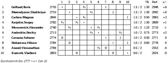 Mit einem ELO-Schnitt von 2777,4 wird die Turnierkategorie 22 erreicht.