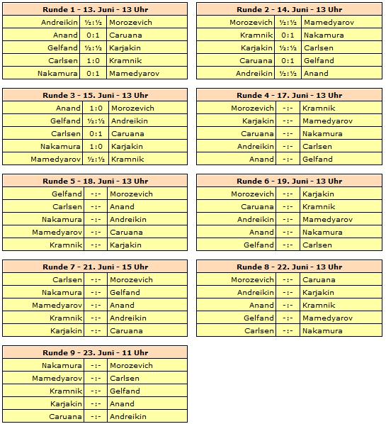Gespielt wird ein neunrundiges Rundenturnier mit zehn Spielern. Rundenstart ist täglich um 13:00 Uhr unserer Zeit - lediglich die letzte Runde startet bereits um 11 Uhr. Ruhetage werden am 16. und 20. Juni eingelegt.