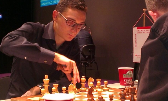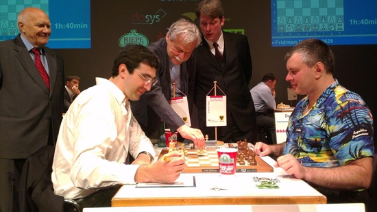 28.07.2013 - Der Beginn der dritte Runde des 41. Sparkassen Chess-Meeting ließ Böses ahnen. Es begann mit einem komplett ereignislosen Remis zwischen Daniel Fridman und Arkadij Naiditsch. Ersterer wollte nicht und Letzterer konnte nicht. Kurz darauf folgte der traurige Tiefpunkt des Tages. Nach unsäglichen 14 Zügen reichten sich Dmitry Andreikin und Wang Hao die Hände zum Zeichen des Friedens. Es folgte ein ausgekämpftes Remis zwischen Georg Meier und Peter Leko. Vladimir Kramnik gab sich alle Mühe, mehr aus Igor Khenkin herauszupressen als nur einen halben Punkt, aber dieser gab sich auch in der dritten Partie keine Blöße. Das Ausrufezeichen des Tages setzte Michael Adams als Schwarzer gegen Fabiano Caruana. 9 Jahre ist es her, dass der Brite seine einzige Berliner Mauer spielte. Was anno 2004 in Wijk aan Zee gegen Leko remis endete, führte ihn heute zu einem vollen Punkt. Caruana wollte zu viel, als er 21.f6? spielte, und wurde trocken ausgekontert. Damit führt Adams mit 2,5/3 vor Kramnik und Meier mit je 2 Punkten. Die vierte Runde beginnt am Montag um 15 Uhr.