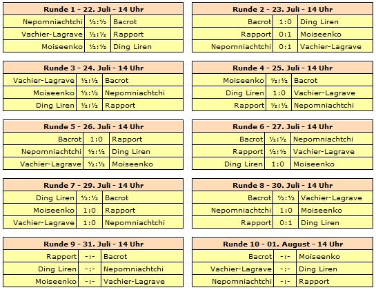 30.07.2013 - In einem spannenden Spitzenduell trennten sich Etienne Bacrot und Maxime Vachier-Lagrave in der achten Runde des 46. Internationalen Schachfestivals friedlich, was Ding Liren zum Anlass nahm, sich alleine an die Spitze zu setzen. Der Chinese wurde von Richard Rapport angesprungen und konnte dessen Opferreigen mit genauer Verteidigung widerlegen. Nach gängiger Rechenweise wären Ding und Bacrot nun punktgleich, doch die "Fußball-Regel" sieht ersteren vorn. Ian Nepomniachtchi gelang derweil eine Bieler Premiere - er gewann gegen Alexander Moiseenko seine erste Partie. Morgen muss er gegen den Spitzenreiter ran, während Bacrot gegen den angeschlagenen Rapport sicherlich auch mit Schwarz etwas versuchen wird. Und auch Vachier-Lagrave wird gegen Moiseenko noch seine Chancen auf mehr als Platz 3 suchen. Ab 14 geht es los.