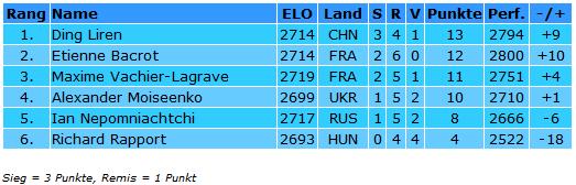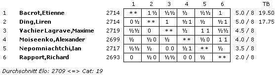 Mit einem ELO-Schnitt von 2709 wird die Turnierkategorie 19 erreicht.