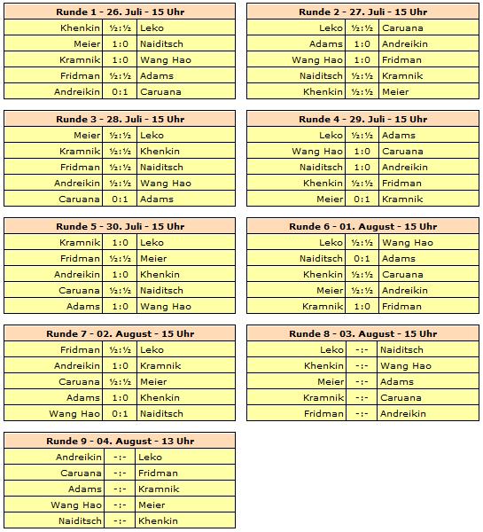 Rundenstart ist täglich um 15:00 Uhr, lediglich die letzte Runde findet bereits um 13:00 statt. Am 31. Juli wird der einzige Ruhetag eingelegt.