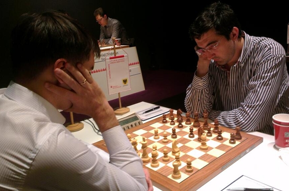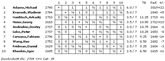 02.08.2013 - Mit seinem dritten Sieg in Serie und dem fünften insgesamt hat Michael Adams beim 41. Sparkassen Chess-Meeting zwei Runden vor dem Ende die alleinige Führung übernommen. In der heutigen siebten Runde musste Igor Khenkin erleben, in welch bestechender Form der Brite ist. Bei diesem Tempo ging nun auch Vladimir Kramnik die Puste aus. Der Russe unterlag Landsmann Dmitry Andreikin. Doch noch ist er nicht endgültig abgehängt, denn in der Schlussrunde steht das direkte gegen Adams an, dessen Performance aktuell jenseits der 3000(!) schwebt. Seinen zweiten Gewinn konnte Arkadij Naiditsch landen und sich so zu Georg Meier auf den dritten Rang vorschieben. Die deutsche Nr. 1 schlug Wang Hao, während Meier gegen Fabiano Caruana nach wechselhaftem Verlauf remisierte. Gut möglich, dass der Deutsche den Italiener an einer Stelle hätte knacken können. Auch Daniel Fridman teilte mit Remiskönig Peter Leko den Punkt. Wenn Sie live erleben wollen, ob schon in Runde 8 die Vorentscheidung über den Turniersieg fällt, sollten Sie entweder frühzeitig in Dortmund sein, oder um 15 Uhr am Rechner sitzen.