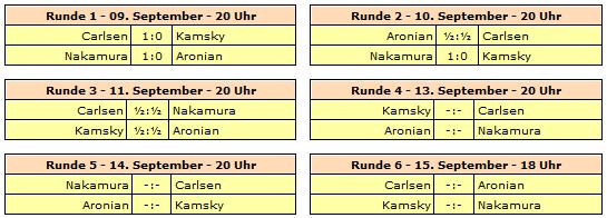 Rundenstart ist täglich um 13 Uhr Ortszeit - also um 20 Uhr unserer Zeit. Die letzte Runde beginnt zwei Stunden früher. Am 12. September wird zur Halbzeit ein Ruhetag eingelegt. Bei Punktgleichheit wird es noch am Tag der Schlussrunde einen Tiebreak geben. Wie genau der aussieht, wurde bisher nicht gesagt, aber starten soll dieser dann um 1 Uhr nachts (unserer Zeit).