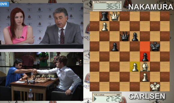 Die launigen Live-Kommentatoren WGM Jennifer Shahade und GM Yasser Seirawan sind längst Kult bei US-Turnieren. Hier sehen wir den Moment des Friedensschlusses zwischen Carlsen und Nakamura.