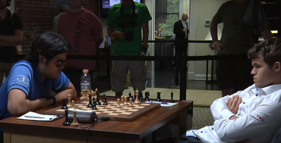 12.09.2013 - Die Hardcore-Fans behaupten, Magnus Carlsen habe in der dritten Runde des Sinquefield Cups die Qualität gegen Hikaru Nakamura geopfert, die Gegenseite sieht das anders und spricht von einem Qualitätsgewinn des Amerikaners. Wie man es auch dreht, Tatsache ist, dass der norwegische WM-Herausforderer erstmals gegen eine Niederlage ankämpfen musste, dies jedoch vorzüglich und letztlich erfolgreich tat. Kleiner Gag am Rande: Nakamura trug während der Partie die ganze Zeit eine Sonnenbrille. Ohne versteckte Augen begegneten sich Gata Kamsky und Levon Aronian. Der mit zwei Niederlagen gestartete Amerikaner ging mit Weiß deutlich vorsichtiger zu Werke. Zwischenzeitlich sah es mal so aus, als könne der Armenier daraus Kapital schlagen, doch unter dem Strich geht auch dieses Remis in Ordnung. Somit behält Nakamura zur Halbzeit seine Führung und wird im zweiten Umlauf Alles versuchen, dass am Ende sein Name auch ganz oben steht. Für die Rückrunde dürfen er und seine Kollegen am Donnerstag neue Kräfte schöpfen, bevor am Freitag um 20 Uhr unserer Zeit die vierte Runde ansteht.