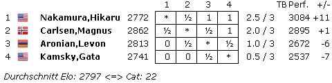 Der Turnierschnitt beträgt unglaubliche 2797 (= Kategorie 22), aber dafür sind es auch nur vier Spieler. Gespielt wird doppelrundig, und die Bedenkzeit ist 90 Minuten für 40 Züge plus 30 Minuten für den Rest der Partie. Zusätzlich erhält jeder Spieler ab dem ersten Zug 30 Sekunden pro Zug.