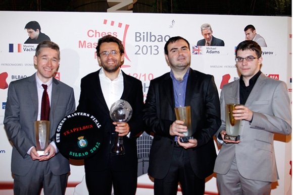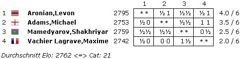 Ein gutes Turnier gespielt hat auch Michael Adams. Der Brite zeigte zuletzt stark aufsteigende Tendenzen und schickt sich an, wieder in die Top 10 der Welt vorzustoßen. In Bilbao wurde er Zweiter, vor allem weil er gegen Maxime Vachier-Lagrave gleich doppelt punktete. Der Franzose wurde letztlich Wertungsdritter, weil es 3 Punkte für einen Sieg und 1 für ein Remis gab. Nach klassischer Zählweise wäre Shakhriyar Mamedyarov vor ihm gewesen, doch der Aseri gewann keine Partie und musste mit dem letzten Platz leben.