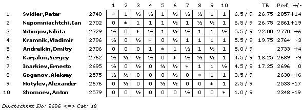 Den größten Nutzen aus Kramniks unglücklicher Niederlage konnte Nikita Vitiugov ziehen. Nach Punkten gleich mit dem 14. Weltmeister hatte der die bessere Wertung und wurde Dritter.