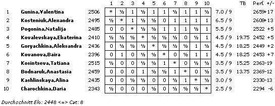 Sowohl Svidler als auch Gunina gelang das Kunststück, ungeschlagen zu bleiben, dennoch setzte sich nur die Dame in der "regulären" Spielzeit durch. Sie erzielte aus ihren 9 Partien beeindruckende 7 Punkte und verwies Alexandra Kosteniuk mit 6,5 Punkten auf Rang 2. Dritte wurde mit 5,5 Punkten Natalija Pogonina. Für Gunina war es nach 2011 der zweite Triumph im eigenen Land.
