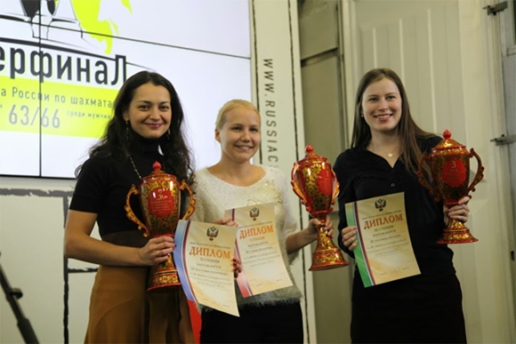 Alexandra Kosteniuk (2.), Valentina Gunina (1.) & Natalija Pogonina (3.)