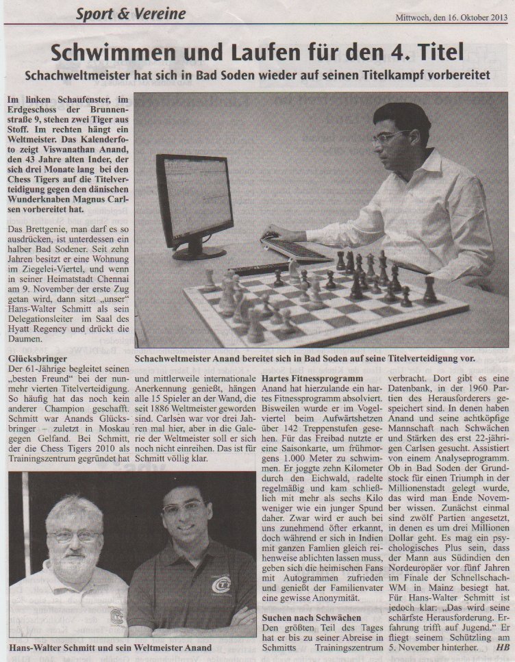 22.10.2013 - Dass sich der amtierende Weltmeister wieder im schönen Bad Soden am Taunus - genauer gesagt im Training Center der Chess Tigers - auf seine bevorstehende Titelverteidigung gegen Herausforderer Magnus Carlsen vorbereitet hat, ist längst kein Geheimnis mehr. Diese Tatsache war der Bad Sodener Zeitung sogar eine ganze Seite wert. Man ist stolz darauf, dass Viswanathan Anand ein halber Bad Sodener ist. Möglich macht dies Hans-Walter Schmitt, welcher erneut als Delegationsleiter und Glücksbringer seinen Freund in Chennai zur Seite stehen wird, damit sich dieser voll und ganz aufs Spielen konzentrieren kann. Ebenfalls ein fester Bestandteil des "A-Teams" ist auch wieder unser Eric van Reem. Im vergangenen Jahr begeisterte er in seinem Blog "Mate in Moscow" mit Hintergrundinformationen und Bildern vom WM-Duell gegen Boris Gelfand, in diesem Jahr heißt der Blog entsprechend "Mate in Chennai". Während die Chess Tigers auf ihrer Webseite von der WM berichten werden, wird van Reem wieder für alle Welt auf Englisch schreiben und exklusive Aufnahmen teilen.