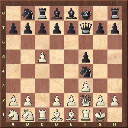 1.f3 Zuerst Läufer- und Damediagonale frei machen zur Entwicklung der Figuren bei gleichzeitiger Attacke auf den Bauer a7. Der stärkste Eröffnungszug laut Fritz13 ist 1.Sb3 +0,21!, gefolgt von 1.f4 +0,17! 1...Sb6 Der 12–Jährige antwortet mit der Entwicklung des Eckspringers bei gleichzeitiger Verteidigung des Bauers und Ausgleich! 2.c4 f5 Sehr aktiv! 3.c5 Sd5 Weiß treibt den ehemaligen Eckspringer ins Zentrum! 4.Df2 Df7 5.0–0 Sf4