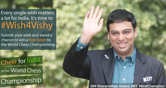 30.10.2013 - Noch benötigt man beide Hände, um die Tage bis zum Start der Schachweltmeisterschaft 2013 an den Fingern abzählen zu können. Am 09. November um 10:30 Uhr unserer Zeit werden Weltmeister Viswanathan Anand und Herausforderer Magnus Carlsen uns Schachfans und auch sich selbst erlösen und die erste Partie um die höchste Krone des königlichen Spiels beginnen. Mittlerweile sind beide Kontrahenten in Indien - der eine, um im Schoß der Familie den Akku vollends aufzuladen, der andere, um sich zu akklimatisieren. Vor seiner Abreise aus Bad Soden am Taunus, wo Anand sich mit seinem Team im Chess Tigers Training Center über Wochen vorbereitete, sprach Ulrich Stock von Die Zeit mit dem Champion. Entstanden ist ein ausführliches Interview, welches wir Ihnen in der Folge präsentieren. Des Weiteren hat auch Anands Sponsor NIIT eine Web-Aktion gestartet. Auf der Seite wish4vishy.com kann man dem Weltmeister sagen, was man ihm wünscht und mit etwas Glück sogar ein Ticket für die Weltmeisterschaft gewinnen.