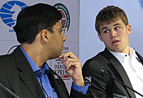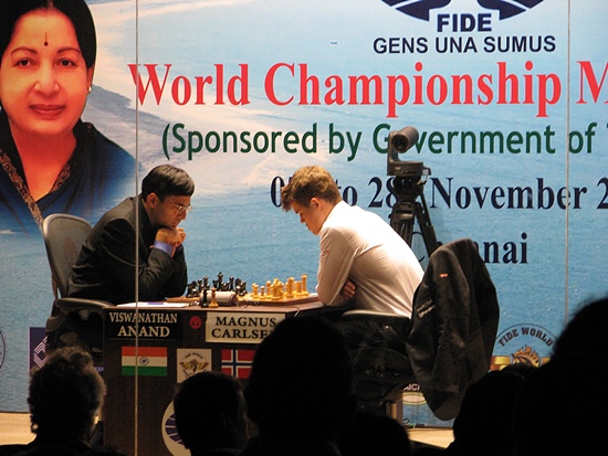 1.Partie: Anand - Carlsen Der Herausforderer Magnus Carlsen beschloss nach 12 Zügen die "Notbremse" zu ziehen, weil Vishy Anand aus Indien, schon mindestens ausgeglichen hatte.
