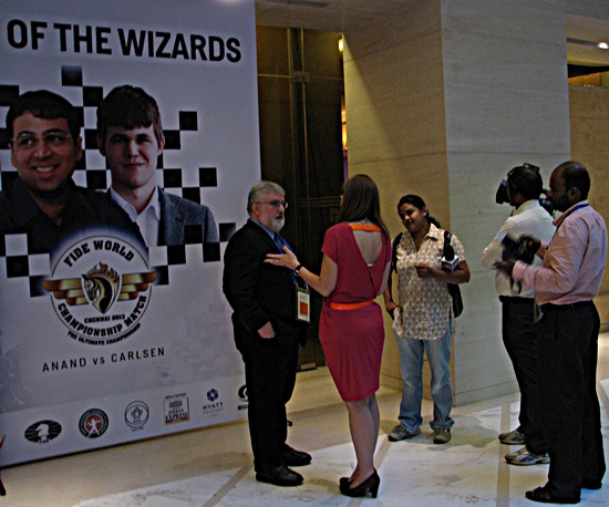 Ein paar ungewöhnliche Bilder zeigen wir im Folgenden, weil es dem Team Anand erlaubt ist in exponierter Umgebung des Weltmeisters zu verweilen, genauso, wie es dem norwegischen Manager Espen Adgestein und Vater Henrik Carlsen im Team Carlsen erlaubt ist. Im Übrigen haben die A-Team-Member immer das Gefühl, dass ihnen der Status von "heiligen Kühen" in Indien zukommt, sodass beim Bilder machen der Körperkontakt, bzw. das Rumgeschubse und Gedrängel viel erträglicher ist - nur weil alle wissen: Team-Anand is here at work!!