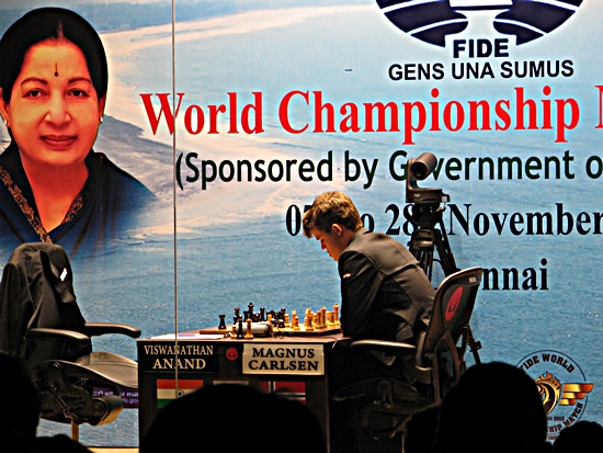1.Partie: Anand - Carlsen Verliert der wirklich nicht, wenn Sie dabei sind!" (Anand ist gemeint) "Hin und wieder eine Partie, aber bisher kein WM-Match seit Mexiko-City 2007, Bonn 2008, Sofia 2010 und Moskau 2012". Das geht doch sicher so weiter, Herr Schmitt? Of course ...