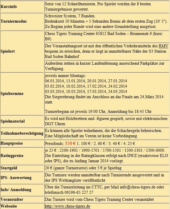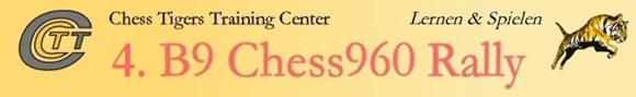 03.01.2014 - Zum Ausklang von 2013 fand im Training Center der Chess Tigers zum vierten Mal die Offene Frankfurter Chess960 Stadtmeisterschaft statt. Dieses Mal sicherte sich FM Klaus Schmitzer mit sagenhaften 6,5 Punkten den alleinigen Sieg. Lediglich IM Sven Telljohann gönnte er einen halben Punkt und verwies den Schönecker auf den zweiten Platz. Auch im dritten Versuch, seinen Premieren-Titel aus dem Jahr 2010 zu wiederholen, scheiterte FM Igor Zuyev. Er wurde Dritter und wird es mit ziemlich hoher Wahrscheinlichkeit 2014 wieder versuchen. Dazwischen liegt aber noch ein langes Schachjahr, in welchem es noch einige andere Chess960 Titel zu gewinnen gibt. Den Anfang macht schon am kommenden Montag der Beginn der 4. B9 Chess960 Rally. An diesem und den folgenden Montagen werden in der Brunnenstraße 9 (B9) in Bad Soden immer ab 19:00 Uhr insgesamt 12 Chess960 Turniere im Schnellschachmodus ausgetragen. Neben der Gesamtwertung lohnt es sich auch, auf Tagessiege zu spielen, denn der jeweilige Gewinner eines Turniers erhält einen hochwertigen Sachpreis. Am 25. Januar findet im SAALBAU Titus-Forum in der Frankfurter Nordweststadt die Chess960-Schnellschach-Einzelmeisterschaft 2013/14 des hessischen Bezirks 5 statt. Neben Ruhm und Ehre freuen sich 150,- Euro auf den Sieger. Weitere Informationen zu allen Turnieren und zahlreiche Bilder von der Frankfurter Chess960 Stadtmeisterschaft finden Sie im folgenden Text.