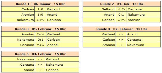 01.02.2014 - Dass Hikaru Nakamura gerne mal eine dicke Lippe riskiert, ist sowas wie sein Markenzeichen. Kürzlich betitelte er sich via Twitter als der einzige Herausforderer von Sauron, wie der Amerikaner Magnus Carlsen gerne nennt. Heute ließ Naka diesen Worten beinahe starke Taten folgen. Bis zum 37. Zug hatte er den Weltmeister komplett überspielt, und die Engines überschlugen sich mit positiven Bewertungen rund um die +7. Aber mit 37.d6?? verzockte er den gesamten Vorteil. Schlimmer noch, der Weg zum Remis war sogar urplötzlich extrem schmal. Als Nakamura registrierte, was er angerichtet hatte, brachte er nicht mehr die Kraft auf, korrekt zu spielen, und verlor. Das ist nur im Schach möglich. Aus einem geschätzten 7:0 wurde letztlich ein 0:1 - bitter! Es wäre übrigens der erste Sieg Nakas gegen Carlsen in einer klassischen Partie gewesen. Die Begegnungen zwischen Levon Aronian und Boris Gelfand sowie Fabiano Caruana und Viswanathan Anand endeten nach spannendem Verlauf friedlich. Damit ist Carlsen zwei Runden vor dem viel zu schnell kommenden Ende alleiniger Tabellenführer. Da Aronian und Gelfand vor dem 40. Zug remisierten, spielten beide noch eine Partie Schnellschach, deren Notation zwar (noch nicht) vorliegt, aber offenbar vom Armenier gewonnen wurde.