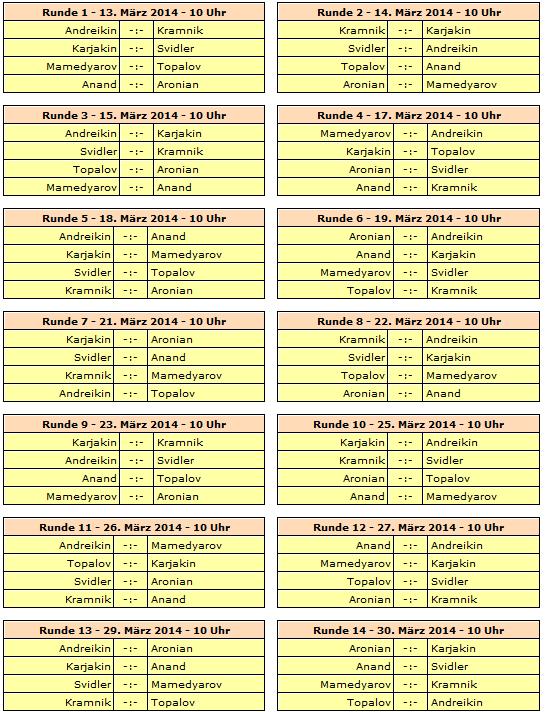 15.02.2014 - Khanty-Mansiysk ist immer wieder ein beliebter Austragungsort für starke Schachturniere, so auch in diesem Jahr. Vom 13. bis 30. März dürfen und werden sich acht Weltklassespieler im Kandidatenturnier 2014 um das begehrte Recht streiten, schon im Herbst den amtierenden Weltmeister Magnus Carlsen zum WM-Duell fordern zu dürfen. Gesetzt ist als jüngst entthronter Champion Viswanathan Anand, welcher sich mit World Cup Sieger Vladimir Kramnik, dessen Vize Dmitry Andreikin, Grand Prix Sieger Veselin Topalov, dessen Vize Shakhriyar Mamedyarov und den nach ELO qualifizierten Levon Aronian und Sergey Karjakin sowie dem siebenfachen russischen Landesmeister Peter Svidler wird messen müssen. Letzterer erhielt quasi die Wild Card des Veranstalters. Natürlich kann man wie immer das Fehlen von Spieler X oder Y betrauern, aber weder Fabiano Caruana noch Hikaru Nakamura, um mal nur zwei Namen zu nennen, die so kursieren, schafften die Qualifikation. Mittlerweile sind die Paarungen des Kandidatenturniers bekannt, welche wir Ihnen in der Folge mit allen wichtigen Zusatzinformationen präsentieren.