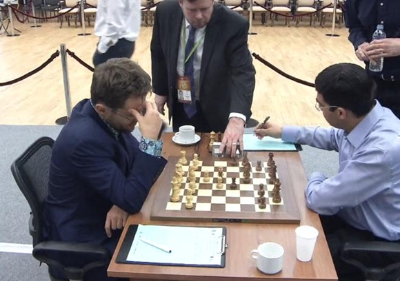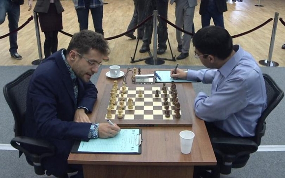 Gleich wird Levon Aronian 3.Db3!? spielen und Viswanathan Anand mächtig überraschen