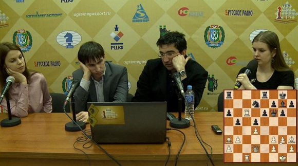 22.03.2014 - Wer sich um 10 Uhr noch etwas schlaftrunken die Partien der 8. Runde des Kandidatenturniers geöffnet hat und gespannt auf das Spitzenduell zwischen Levon Aronian und Viswanathan Anand schaute, wird spätestens nach dem dritten Zug von Weiß hellwach gewesen sein. 1.c4 c6 2.Sf3 d5 3.Db3!? habe er noch nie gesehen, gab Anand zu, und so musste er beinahe wie beim Chess960 selbst eine Eröffnung erfinden. War 3.Db3 noch keine Neuerung, 3...d4!? ist es laut der aktuellen Megabase auf jeden Fall. Mit weiter 3.e3 c5!? bot Anand ein Gambit an, welches Aronian tatsächlich annahm (siehe Diagramm). Ob sich das Anand Gambit durchsetzen wird, ist fraglich. Nicht, weil es schlecht ist, aber es wird wahrscheinlich nicht viele Nachahmer der weißen Spielweise geben. Aronian sprach sogar breit grinsend davon, nahezu auf Verlust gestanden zu haben. Davon wollte der 15. Weltmeister aber nichts wissen und sah eher Kompensation für den Bauern. Allerseits freute man sich in der Folge auf einen packenden Kampf um die Tabellenführung, aber plötzlich vollführten beide Spieler eine Vollbremsung und wiederholten nach knapp 1,5 Stunden Spielzeit die Züge. Einige Zeit später hatten sich Veselin Topalov und Shakhriyar Mamedyarov nach einem durchaus spannenden Najdorf-Sizi in ein ausgeglichenes Turmendspiel getauscht. Remis Nr. 3 produzierten Vladimir Kramnik und Dmitry Andreikin in einer eher selten gespielten Variante im Slawen. Zwischenzeitlich opferte der 14. Weltmeister zwei Bauern und musste letztlich zufrieden sein mit dem halben Punkt. Die längste Partie spielten Peter Svidler und Sergey Karjakin. Erstmals im laufenden Wettbewerb wurden mehr als 60 Züge gespielt, und es sah lange so aus, als könne Karjakin seinen ersten Sieg erzielen. Aber Svidler rettete sich in ein haltbares Endspiel mit ungleichfarbigen Läufern. Doch dann bot er seinem Gegner eine phantastische Möglichkeit, per Qualitätsopfer zu gewinnen, und die ließ sich Karjakin nicht entgehen. Nach 82 Zügen und knapp 6,5 Stunden Spielzeit durfte er endlich den ersten vollen Punkt notieren. Damit dürfte sich der Kreis der möglichen Turniersieger auf das Trio Anand, Aronian und Kramnik geschrumpft haben.