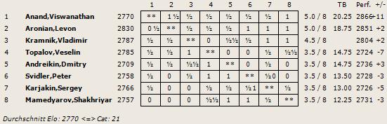 Manchmal sind Kramniks Aussagen seltsam... So antwortete er auf die Frage, ob er nicht etwas zu aggressiv spiele unter anderem so: "...gegen mich patzt ja niemand, also muss ich so spielen, um zu gewinnen..." Spontan frage ich mich, was wohl Shak Mamedyarov dazu sagen würde...