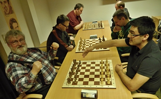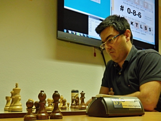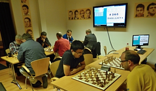 "Chess Rally Etappe 11" - In der ersten Runde gelingt Hans-Walter Schmitt ein schön heraus gespielter Sieg gegen Patrick Chandler. Mit nur noch 35 Sekunden auf der Uhr gegen 8:30min von seinem immer schnellspielenden Gegner von den Schachfreunden Schöneck. Ansonsten alle Bretter in voller Konzentration! Im Vordergrund Berang Sadeghi gegen Thomas Meisegeier 1:0