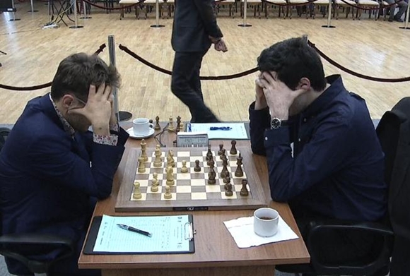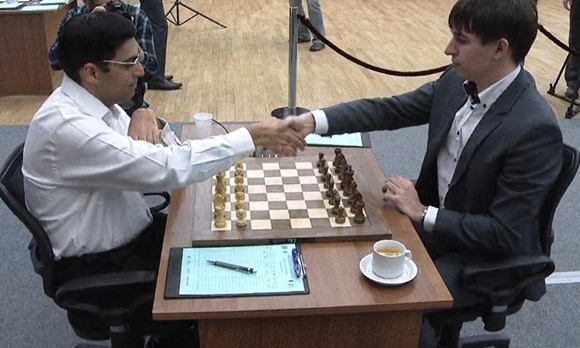 27.03.2014 - Viel hat nicht gefehlt, dann wäre das Kandidatenturnier mit der heutigen Runde 12 schon so gut wie entschieden gewesen. Gegen Dmitry Andreikins Kopie von Carlsens Caro-Kann bei der WM 2013 erhielt Viswanathan Anand eine ausgezeichnete Stellung und hätte beinahe auch gewonnen. Doch das Gegenspiel des findigen Russen beeindruckte den 15. Weltmeister doch etwas mehr als nötig, und so stimmte er lieber einem Remis zu. Da Levon Aronian gegen Vladimir Kramnik ebenefalls nicht über ein Remis hinaus kam, Sergey Karjakin Gleiches gegen Shakhriyar Mamedyarov ereilte, und Peter Svidler gegen Veselin Topalov unterlag, kann sich Anand weiterhin komfortabel an der Spitze halten. Rechnerisch ist natürlich noch Einiges möglich, aber so langsam darf der amtierende Weltmeister seine erneute Vorbereitung auf den Inder beginnen.