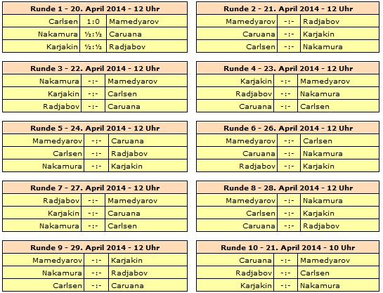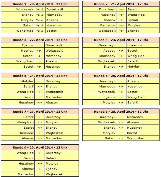 Rundenstart ist täglich um 12 Uhr. Die letzte Runde des A-Turniers beginnt um 10 Uhr. Am 25. April wird der einzige Ruhetag eingelegt.