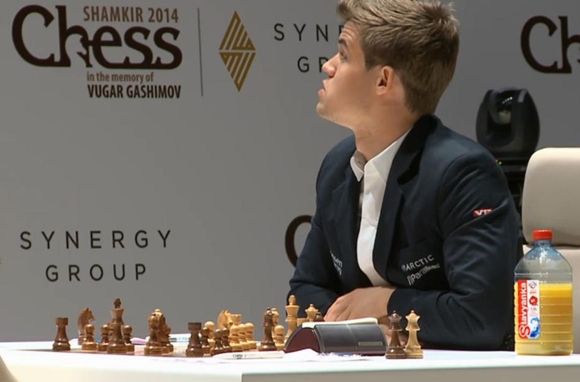 Bis zum 11. Zug spielte Magnus Carlsen quasi gegen sich selbst, denn die gleiche Stellung hatte er als Schwarzer gegen Boris Gelfand bei der London Chess Classic 2013 auf dem Brett