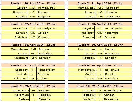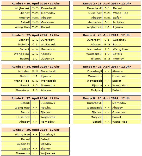Rundenstart ist täglich um 12 Uhr. Die letzte Runde des A-Turniers beginnt um 10 Uhr. Am 25. April wird der einzige Ruhetag eingelegt.