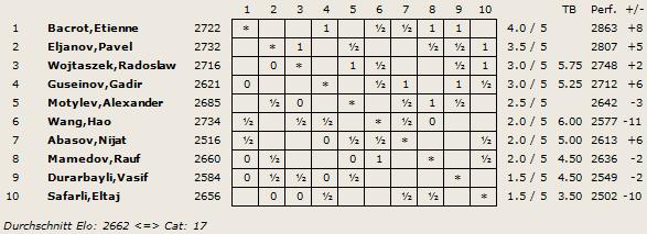 Das B-Turnier, oder auch Bacrot-Turnier, wie man es derzeit mit Fug und Recht nennen darf, ist fest in Händen der französischen Nr. 2. Etienne Bacrot fegte heute in 26 Zügen Rauf Mamedov hinweg, der nun wirklich kein Leichtgewicht ist. Damit liegt er nach nur fünf Runden bei +3 also 4 Punkten und kann völlig entspannt in den morgigen Ruhetag gehen. Folgen kann mit +2 im Moment nur Pavel Eljanov, welcher gegen Eltaj Safarli zwar zwei Mal zufassen musste, seinen jungen Gegner aber schließlich bezwang. Den dritten Sieg des Tages genehmigte sich Gadir Guseinov gegen Landsmann Nijat Abasov. Der Rest endete unentschieden. Das nächste Mal wird am Samstag zu den Figuren gegriffen. Ab 12 Uhr können Sie dabei sein, und ab ca. 12:30 Uhr ist GM Thomas Luther für Sie bei ChessBase live on air.