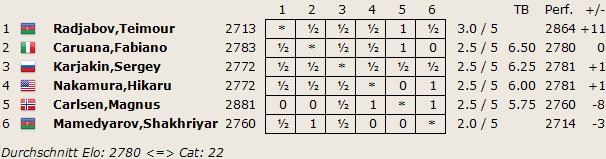 24.04.2014 - Ist man bei einem Gegner als "guter Klient" bekannt, und heißt dieser Gegner auch noch Magnus Carlsen, dann hat man in der Regel ein unlösbares Problem. Teimour Radjabov hat seit 2008 keine Partie gegen den jetzigen Weltmeister gewonnen und musste gegen diesen in der heutigen fünften Runde des Gashimov Memorials mit Schwarz spielen. Mit der Schachliebe seines Lebens - der Königsindischen Verteidigung - machte der Aseri gleich die erste Kampfansage und nutzte in der Folge die seltenen Fehler Carlsens perfekt zu einem hochverdienten Sieg. Jede Serie reißt irgendwann, bestimmt auch die von Carlsen. Zwei Niederlagen en suite setzte es für ihn zuletzt in Bilbao 2010, eine dritte wird er in Runde 6 garantiert mit aller Kraft zu verhindern suchen. Für Radjabov nahmen die guten Nachrichten noch kein Ende, denn Landsmann Shakhriyar Mamedyarov knetete Fabiano Caruana so lange, bis dieser kurz vor dem Remis einen dicken Bock schoss und verlor. Somit gibt es einen durchaus überraschenden Wechsel an der Spitze. Den Platz an der Sonne hat jetzt Radjabov inne und zwar alleine. Sehr spannend war auch das Remis zwischen Hikaru Nakamura und Sergey Karjakin. Beide Seiten lösten die die wechselseitigen Probleme sauber und erreichten so das logische Ergebnis.