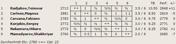 Zwei Turniere finden parallel statt. Im A-Turnier spielen sechs Teilnehmer ein doppelrundiges Turnier. Am Start sind Magnus Carlsen, Fabiano Caruana, Hikaru Nakamura, Sergey Karjakin, Shakhriyar Mamedyarov und Teimour Radjabov.