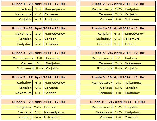Rundenstart ist täglich um 12 Uhr. Die letzte Runde des A-Turniers beginnt um 10 Uhr. Am 25. April wird der einzige Ruhetag eingelegt.
