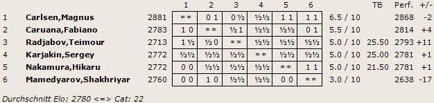 Zwei Turniere finden parallel statt. Im A-Turnier spielen sechs Teilnehmer ein doppelrundiges Turnier. Am Start sind Magnus Carlsen, Fabiano Caruana, Hikaru Nakamura, Sergey Karjakin, Shakhriyar Mamedyarov und Teimour Radjabov.