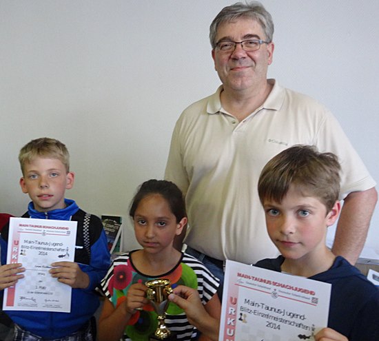Mit Urkunden v.l.n.r: Alina Kick, SC Frankfurt-West, 3.Platz (+9/=0/-4) / Constantin Ackermann, SV Hofheim, Sieger (+13/=0/-0) und Viktor Edelmann, SC Frankfurt-West, 2.Platz, (+10/=0/-3). Im Hintergrund der souveräne Turnierleiter Günter Weber.
