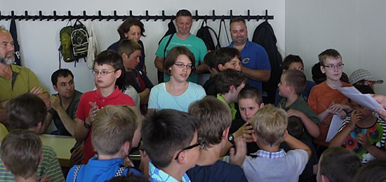 Mädchen inmitten von jungen Schachspielern, Eltern und Betreuern